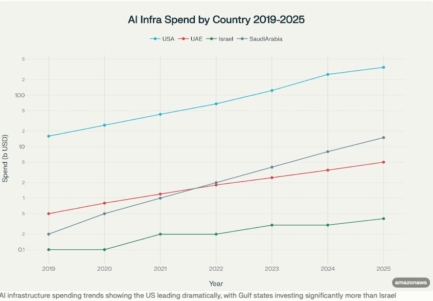 Israel does not need to spend as much as the Gulf monarchies and Big US Tech firms. Also, it can’t. Israel maintains its edge through innovation and talent, despite smaller absolute spending levels. The country’s focus on research institutes, talent development, and leveraging existing tech sectors for new ideas, is still an effective approach to AI leadership.