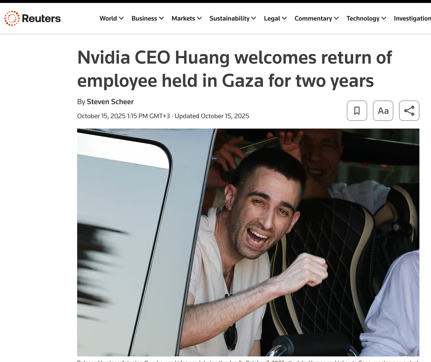 Then came the story that gave all this weight. Avinatan Or, a 32-year-old Nvidia electrical engineer kidnapped at the Nova music festival, was released in October 2025 after 738 days in captivity. For two years, Nvidia Israel’s HR chief sent weekly emails counting the days, and every quarter Jensen Huang mentioned Or’s name in global meetings to remind 40,000 employees that one of their own was still missing.